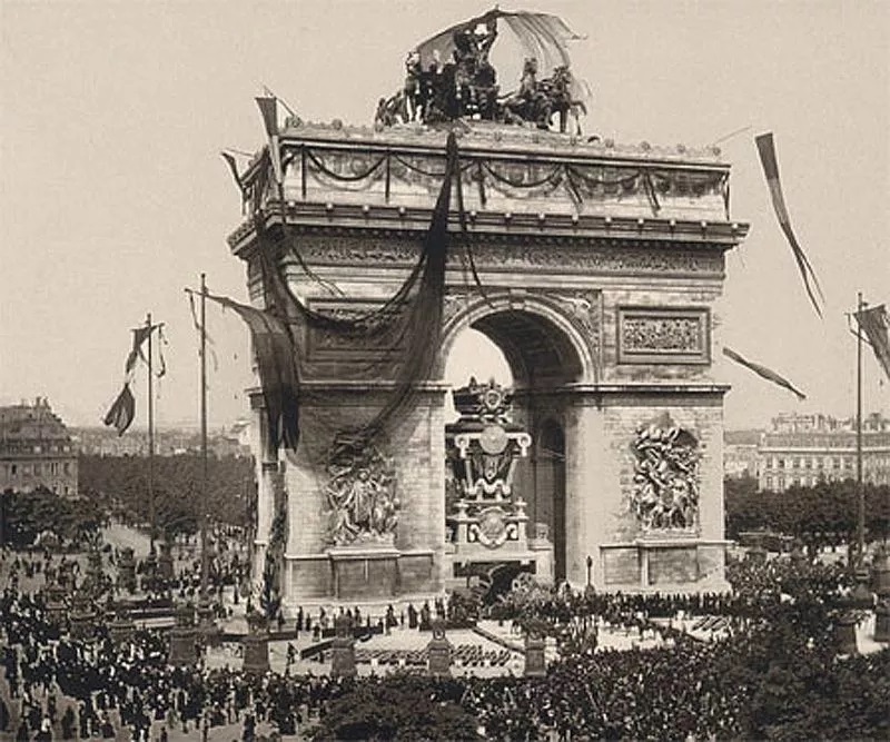 Le 21 mai 1885, une loi a ordonné des obsèques nationales pour Victor Hugo et un décret présidentiel destine le corps de l’écrivain au Panthéon (doc 1), église parisienne transformée en sanctuaire national, accueillant les corps des grands personnages de la Nation. La réputation de Hugo tient en partie à son oeuvre littéraire (doc 2) mais également dans son engagement pour la République et la laïcité(doc 3). L’Arc de triomphe, haut lieu de l’Etat républicain et de la nation accueille le cercueil de l’auteur. Les signes du deuil sont nombreux dans cette cérémonie laïque : voile sur les statuts, flammes brûlant autour du monument. La foule est nombreuse (doc 4) au point que des commerçants se multiplient pour profiter du rassemblement qui prend des airs de fête populaire. Tout cela semble valider une unanimité, cette fameuse « communion nationale et républicaine » que l’on attendait. Mais on peut repérer certaines résistances limitant cette unanimité : les catholiques sont très réticents devant la célébration de ce laïc très engagé (doc 5) présenté comme un héros par les autorités.